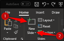 Para añadir una nueva diapositiva, vaya a la sección «Diapositivas» de la pestaña «Inicio». Aquí tendrá dos opciones para agregar una nueva diapositiva.