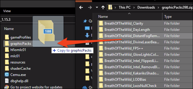 Abre la carpeta comprimida, presione Ctrl+A para seleccionar todo y arrástralos a la carpeta graphicsPacks en tu instalación de Cemu. No tienes que copiarlos todos si sólo estás jugando a un juego, pero son sólo archivos de texto lo suficientemente pequeños como para que no importe mucho.