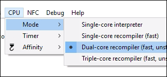 Una opción importante es la configuración de la CPU, que se encuentra en CPU > Modo. Si tienes un sistema de cuatro núcleos o superior, configúralo en Compilador de doble o triple núcleo. Esto hará que Cemu utilice más hilos y facilitará el uso de su CPU.