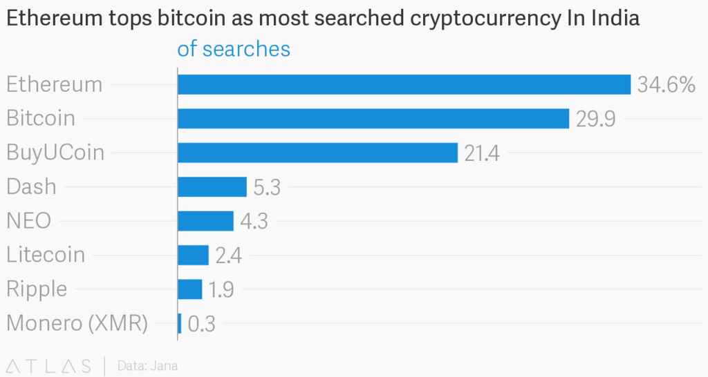 Curiosamente, una investigación reciente demostró que Ethereum, la plataforma de blockchain más popular del mundo para aplicaciones descentralizadas (dApps). Ha destronado de hecho a Bitcoin en la India, convirtiéndola en la criptomoneda más buscada.