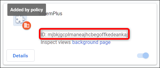 Desplácese hacia abajo hasta que encuentre la extensión añadida por política. Busque la que no puede eliminar normalmente de la página Extensiones. Resalte el ID de la extensión y presione Ctrl+C para copiarla en su portapapeles.