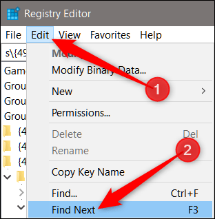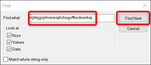 Haga clic en «Editar» y, a continuación, en «Buscar siguiente» para localizar cualquier otra entrada del registro que contenga el ID de la extensión y, luego, eliminarla también.