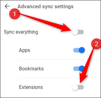 En primer lugar, desea administrar la configuración de sincronización a través de Chrome y desactivar la sincronización de extensiones con otros dispositivos. No querrá que todo este progreso se vaya por la ventana tan pronto como limpie Chrome y haga que todo vuelva a instalarse.