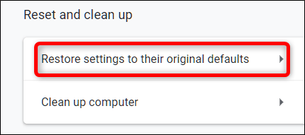 Desplácese hasta la parte inferior y haga clic en «Restore settings to their original defaults» (Restaurar la configuración a sus valores originales predeterminados), que se encuentra bajo el encabezado Restablecer y limpiar.