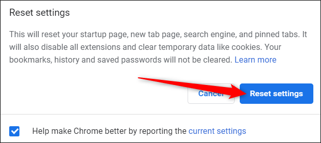 No eliminará sus marcadores, historial del navegador o contraseñas guardadas. Haga clic en «Restablecer configuración» cuando esté listo para continuar.