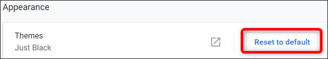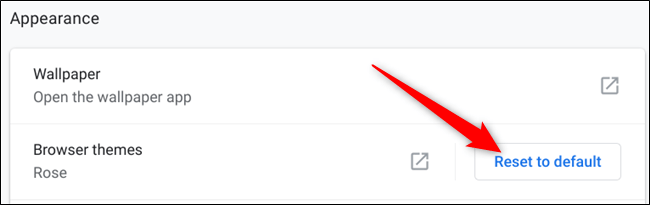 Abra la aplicación Configuración y desplácese hacia abajo hasta el encabezado Apariencia. Una vez aquí, haga clic en «Reset to default,» junto a la opción «Browser Themes».