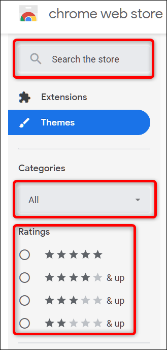 Ahora que tenemos la tienda web de Chrome abierta, puedes buscar temas usando la barra de búsqueda, el selector de categoría (aunque las únicas dos opciones son Google y los artistas), o por puntuación.