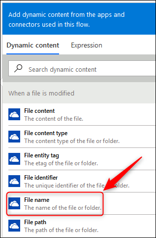 Queremos que la línea de asunto diga «[nombre del archivo] ha sido modificado,» donde «[nombre del archivo]» es reemplazado por el nombre del archivo. Para ello, haga clic en «Nombre del archivo» en el panel «Contenido dinámico».
