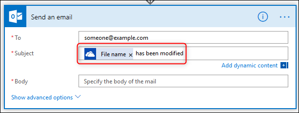 Añada la dirección de correo electrónico a la que desea enviar el mensaje en el campo «Para». Cuando haga clic en el cuadro «Asunto», verá que aparece un panel de «Contenido dinámico» a la derecha. Esto le da la opción de agregar una línea de asunto al correo electrónico basado en el archivo que ha sido modificado.