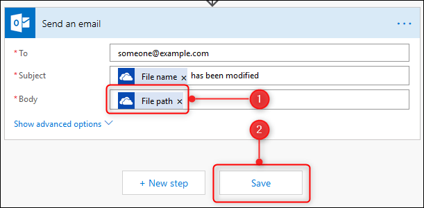 Queremos que sea fácil encontrar el archivo también, así que en la línea «Body» vaya de nuevo al panel «Dynamic content» y haga clic en «File path» para añadirlo al cuerpo. El flujo se ha completado ahora, así que haga clic en Guardar.