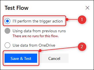 En el panel «Test Flow» que se desliza hacia afuera, haga clic en «I’ll perform the trigger action» y haga clic en «Save & Test».