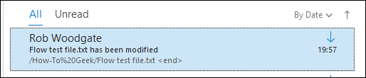 Cuando revises tu correo electrónico, verás que se te ha enviado una alerta de correo electrónico, con la línea de asunto mostrando el nombre del archivo y el texto que has añadido, y el cuerpo mostrando la ruta del archivo.