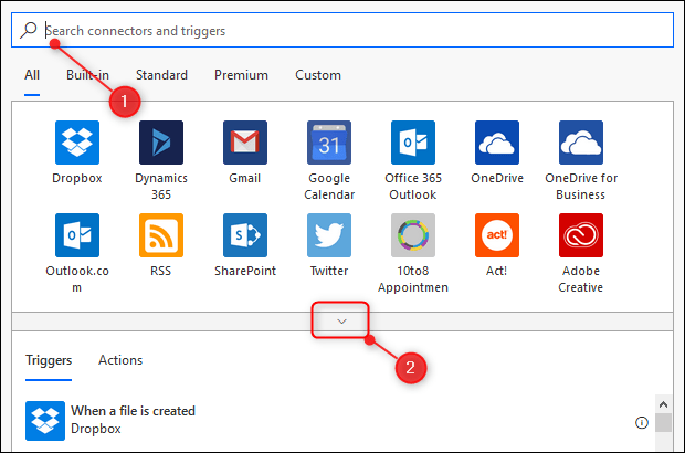 En este punto, tendrá que seleccionar un disparador para iniciar el flujo. Puede buscar un servicio en particular o elegir uno de la lista. Haga clic en la flecha hacia abajo debajo de las dos filas de iconos para ver todos los servicios disponibles.