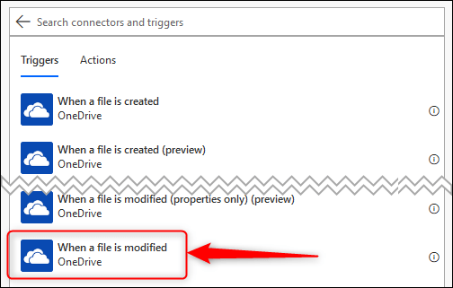 Una vez que haya iniciado sesión, se mostrará una lista de activadores de OneDrive. Estamos buscando el disparador «When a file is modified» (Cuando se modifica un archivo), que se encuentra en la parte inferior.