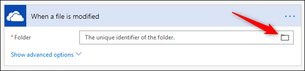 Haga clic en «Cuando se modifica un archivo» para abrir las opciones de este disparador. La única opción necesaria es seleccionar la carpeta que contiene los archivos que desea monitorizar, así que haga clic en el icono de la carpeta.
