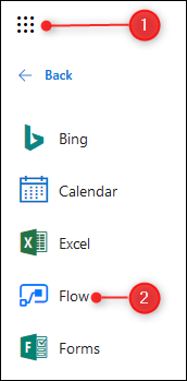 Necesitará un plan gratuito o de pago para utilizar Flow, así que inscríbase en uno si aún no lo ha hecho. Dirígete al lanzador de aplicaciones de Office 365 (los nueve puntos de la esquina superior izquierda) y haz clic en Flow para lanzarlo.