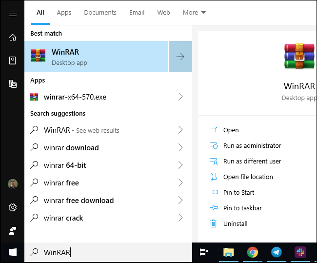 Si no está seguro de si tiene WinRAR instalado, realice una búsqueda en el menú Inicio de «WinRAR». Ahora, Si ves un acceso directo de WinRAR, está instalado. Si no ves un atajo de WinRAR, no lo es.