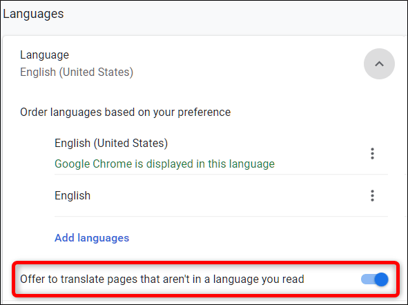 De forma predeterminada, Chrome tiene la traducción habilitada. Si desea desactivar esta función, haga clic en el botón de conmutación en la posición de apagado. Si va a seguir utilizando la función de traducción, no haga nada.