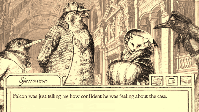 Juegas como el abogado Monsieur Jayjay Falcon, un pájaro literal, mientras recoges casos, investigas escenas de crímenes parisinos y entrevistas a testigos. Junto con tu fiel aprendiz Sparrowson, tomas todo lo que has aprendido y luchas en la corte.