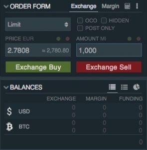 Bitfinex le ofrece una opción de tres carteras: cambio, margen y financiación. En este caso, usted seleccionará la cartera de cambio. Una vez que los fondos se reflejan, usted está a punto de comprar IOTA. A continuación, vaya al panel de control y haga clic en «Trading» y seleccione IOTA donde Bitfinex le dará la opción de operar con USD o BTC.
