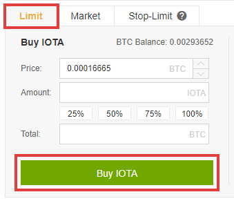 Aparecerá una nueva barra lateral izquierda con todos los detalles que necesita para la operación. Para empezar, podría ser confuso. Sin embargo, seleccione la opción «Límite» e introduzca la cantidad máxima de USD, BTC o ETH que desea operar. A continuación, haga clic en el botón verde de arriba `Precio USD/BTC/ETH’ y esto calculará automáticamente cuántos IOTAs puede comprar con su límite establecido.