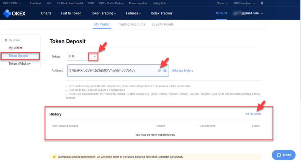 Serás redirigido a la sección Depósito de Token y copiarás la dirección para que puedas transferir Bitcoins a tu cuenta OKEx. Después de depositar sus fondos, vuelva a «Mi Cartera» para revisar su saldo. Con BTC en su cuenta, es hora de iniciar una operación con IOTA.