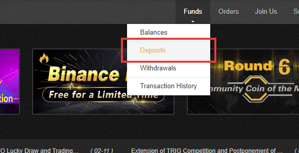 La siguiente etapa es agregar fondos a su cuenta. Con Binace, usted puede comprar a través de otra criptomoneda como Bitcoin. En el panel de control, haga clic en la sección «Fondos» y luego en «Depósitos/retiros». Haga clic en la pestaña de depósito y luego seleccione el cripto que desea depositar.