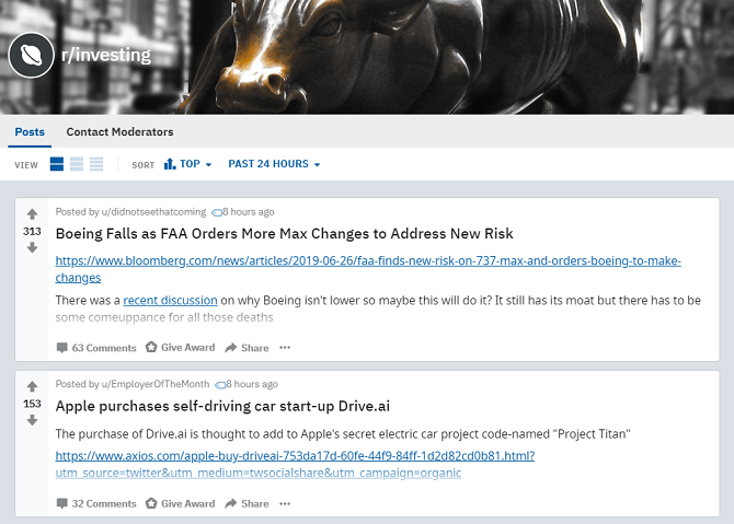 Este subreddit actúa como el punto central de Reddit para cualquier cosa que tenga que ver con los mercados. Tiene casi un millón de miembros. La calidad de la discusión es más adecuada para principiantes e intermedios; hay una buena cantidad de publicaciones tipo «¿Qué debo hacer con mi dinero?». Dicho esto, hay algunas perlas de sabiduría, y también hay un flujo razonablemente regular de artículos de noticias.