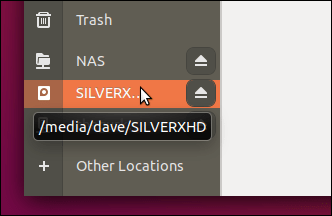 En este ejemplo, el tooltip nos informa que el punto de montaje para el sistema de ficheros en la unidad externa es «/media/dave/SILVERXHD».