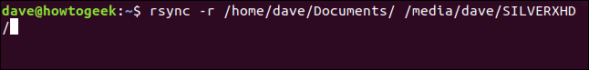 Si quería que el directorio Documentos y su contenido se copiara en la unidad externa, elimine el «/» del final de «/home/dave/Documents» en la línea de comandos, de la siguiente manera:
