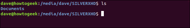 Para hacer una copia de seguridad de sus datos en un disco duro externo, el disco duro debe estar montado y accesible para usted. Si puedes escribirle, entonces también puede hacerlo rsync. En este ejemplo, un disco duro USB externo llamado SILVERXHD (para «Silver eXternal Hard Drive») se conecta al ordenador Linux. Ha sido auto-montado por el sistema operativo.