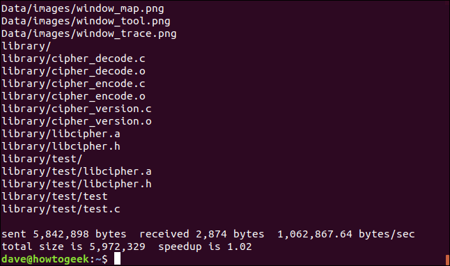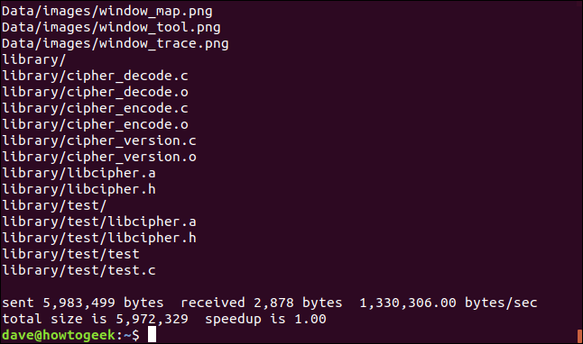 Si ejecutamos rsync una vez más, podemos ver que no hay archivos que transferir porque no ha habido cambios, pero todavía hay algunos bytes transferidos de un lado a otro. Esta es la cantidad de datos que deben transferirse para comparar la lista de archivos en el destino con la lista de archivos en la fuente.