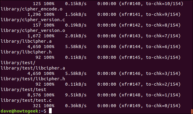 También estamos usando la opción –partial. rsync eliminará los archivos parcialmente transferidos causados por fallos en la red u otras interrupciones en el sistema de Linux. La opción –partial obliga a rsync a dejar los archivos parcialmente transferidos en el destino. El rsync de tiempo neto se ejecuta no tendrá que volver a transferir las partes de los archivos parcialmente transferidos.