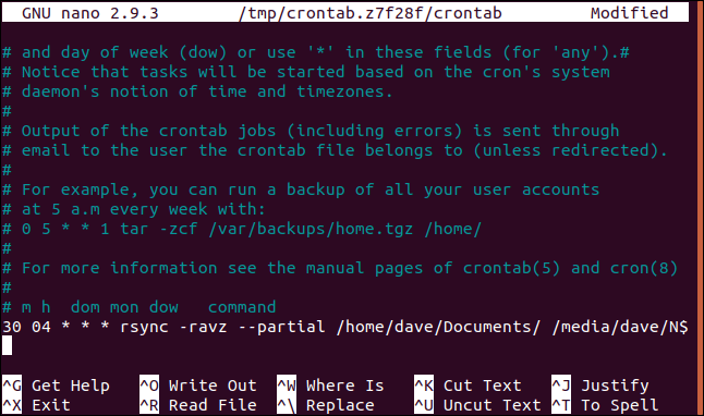 Configuraremos una copia de seguridad automatizada para que se ejecute cada día a las 04:30 (si la computadora está encendida a esa hora, por supuesto). La sintaxis del comando rsync no cambia en absoluto.