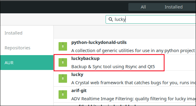 En Manjaro debe instalar luckyBackup desde el Repositorio de Usuarios de Arch (AUR). Puede hacerlo con el gestor de paquetes de pamac.