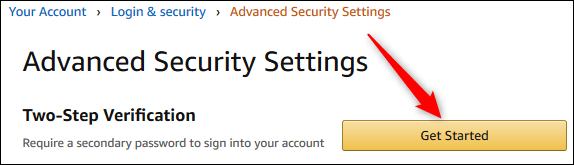 En la parte superior de la página, junto al título «Verificación en dos pasos», haz clic en «Comenzar». Y sí, Amazon lo llama verificación en dos pasos en lugar de autenticación de dos factores. Pero es lo mismo.
