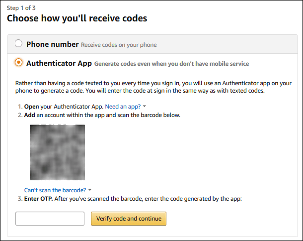 Si ha iniciado sesión en el sitio web de Amazon, la siguiente etapa te brinda información sobre cómo usar la 2FA si estás en un dispositivo que no puede mostrar una segunda pantalla.