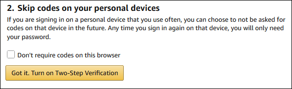 En la misma página, también puedes decirle a Amazon que tu navegador actual no requiere una verificación de 2FA activando la casilla de verificación: «No requiere códigos en este navegador». Solo debes hacer esto si estás en tu propia computadora, no en la de otra persona o en una computadora compartida.