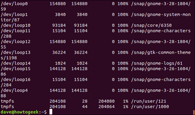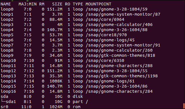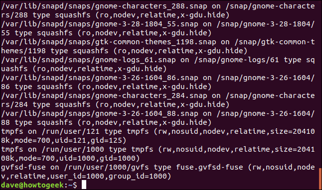 La salida de mount puede ser más larga de lo que esperabas, especialmente si has utilizado el método snap para instalar software. Cada vez que usas snap, adquiere otro pseudo-sistema de archivos y estos se enumeran por mount. Por supuesto, estos no tienen dispositivos físicos asociados con ellos, por lo que solo están ocultando la imagen real.