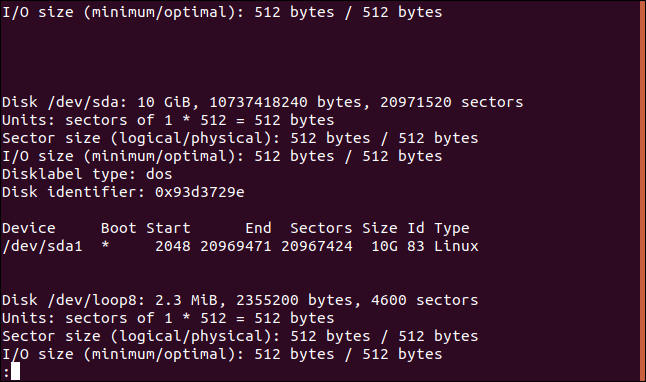 Utilizaremos la opción -l (lista) para enumerar las tablas de partición. Debido a que la salida puede ser muy larga, canalizaremos la salida desde fdisk a través de «less». Debido a que fdisk tiene el potencial de alterar las tablas de particiones de disco, debemos usar sudo.