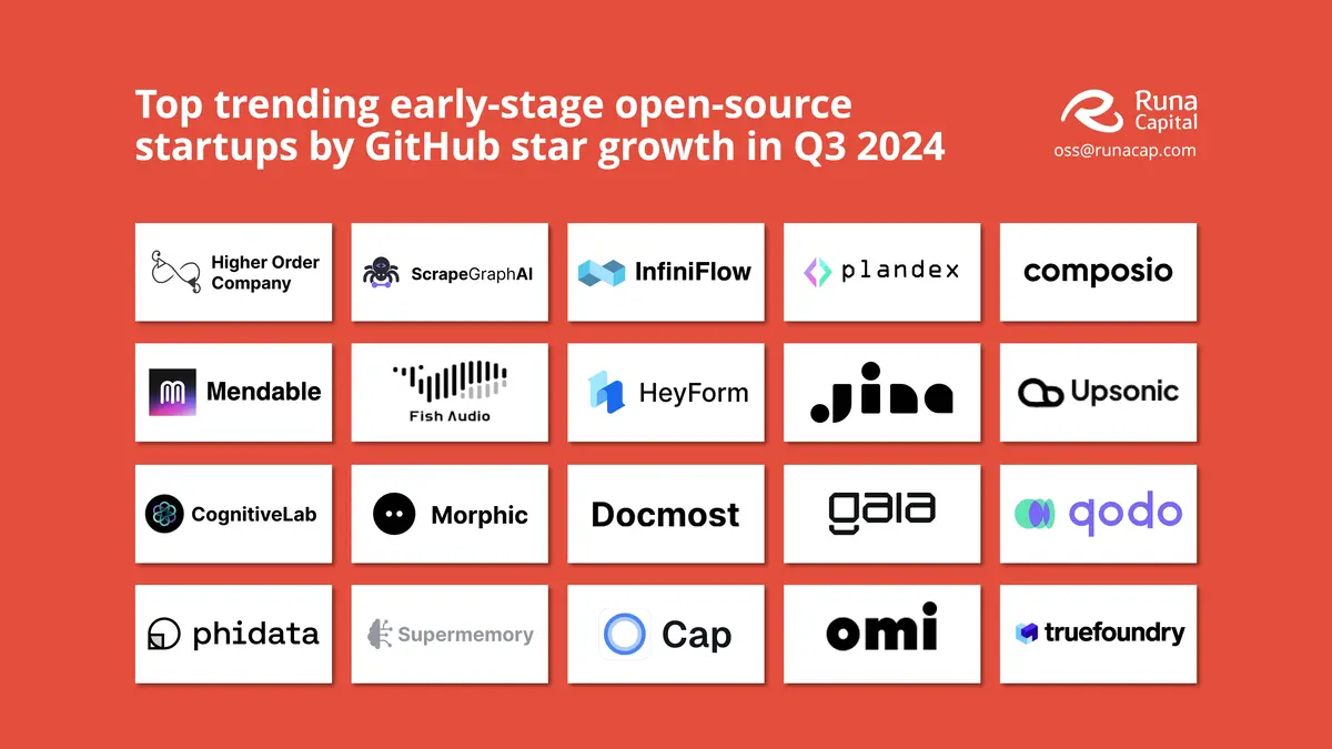 Runa Open Source Startup Index has operated since 2020 and it serves as a quarterly update on fastest-growing projects using the GitHub “stars” metric. It’s an element that works like a hearth or thumb-up on social media platforms. Since 2023, Runa produces annual reports to highlight the most popular commercial open source startups of every year. Here you can find the 20 hottest startups of 2024.